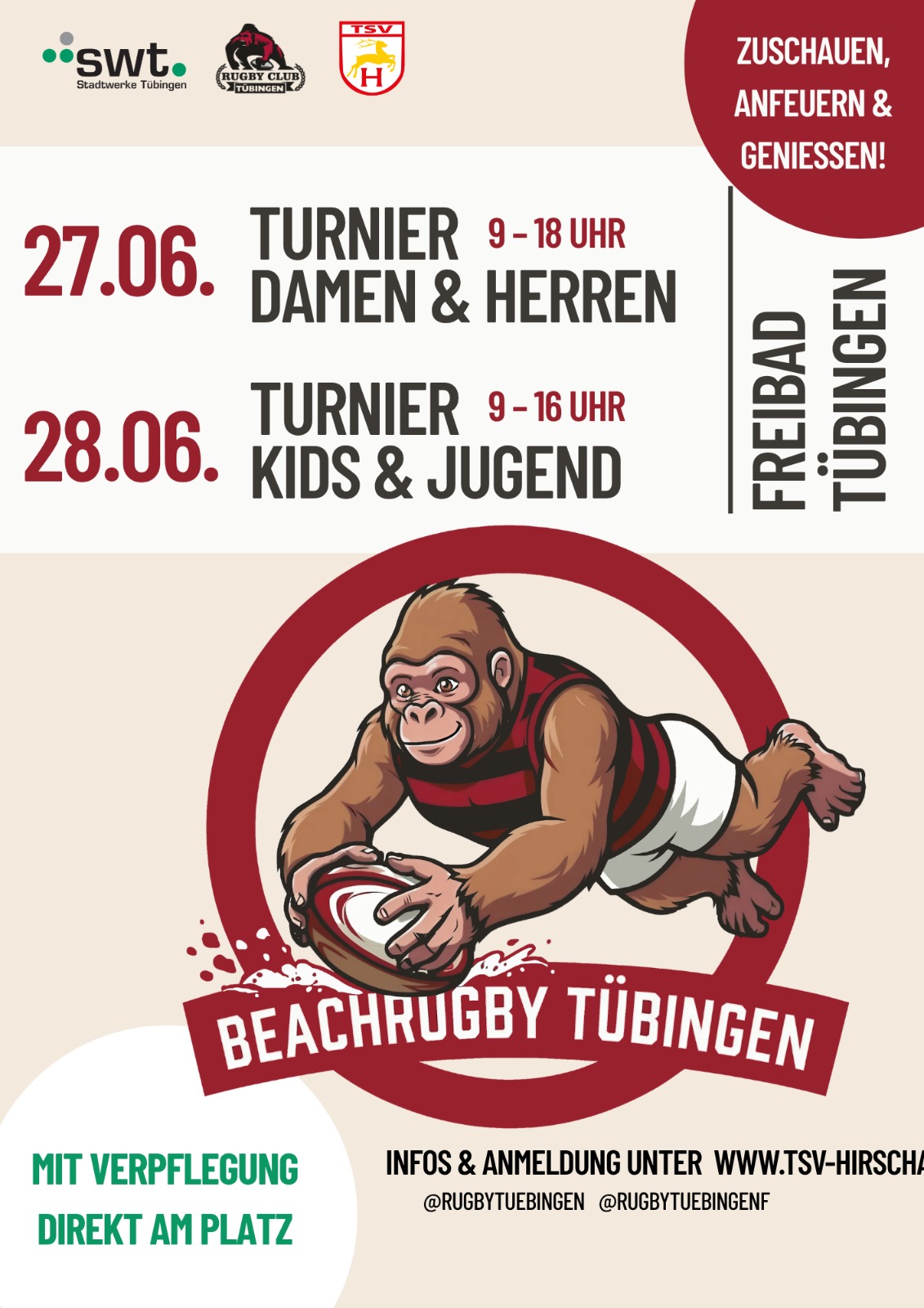 Unser alljährliches Beachrugby-Turnier findet dieses Jahr am 27.06. und 28.06.2026 im Tübinger Freibad statt!